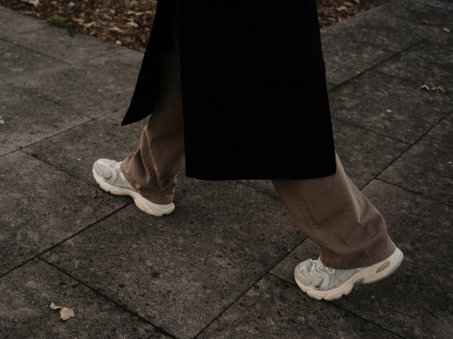 カジュアルなアイテム同士を合わせるのではなく、あえてきれいめなアイテムと掛け合わせるのが大人の流儀です。センタープレスの効いたスラックスや、仕立ての良いウールのロングコート。かっちりとした装いの足元をスニーカーで外すことで、肩の力が抜けた上品な「抜け感」が完成します。歩くたびに揺れるコートの裾と軽快な足元が、余裕のある洗練された佇まいを演出。